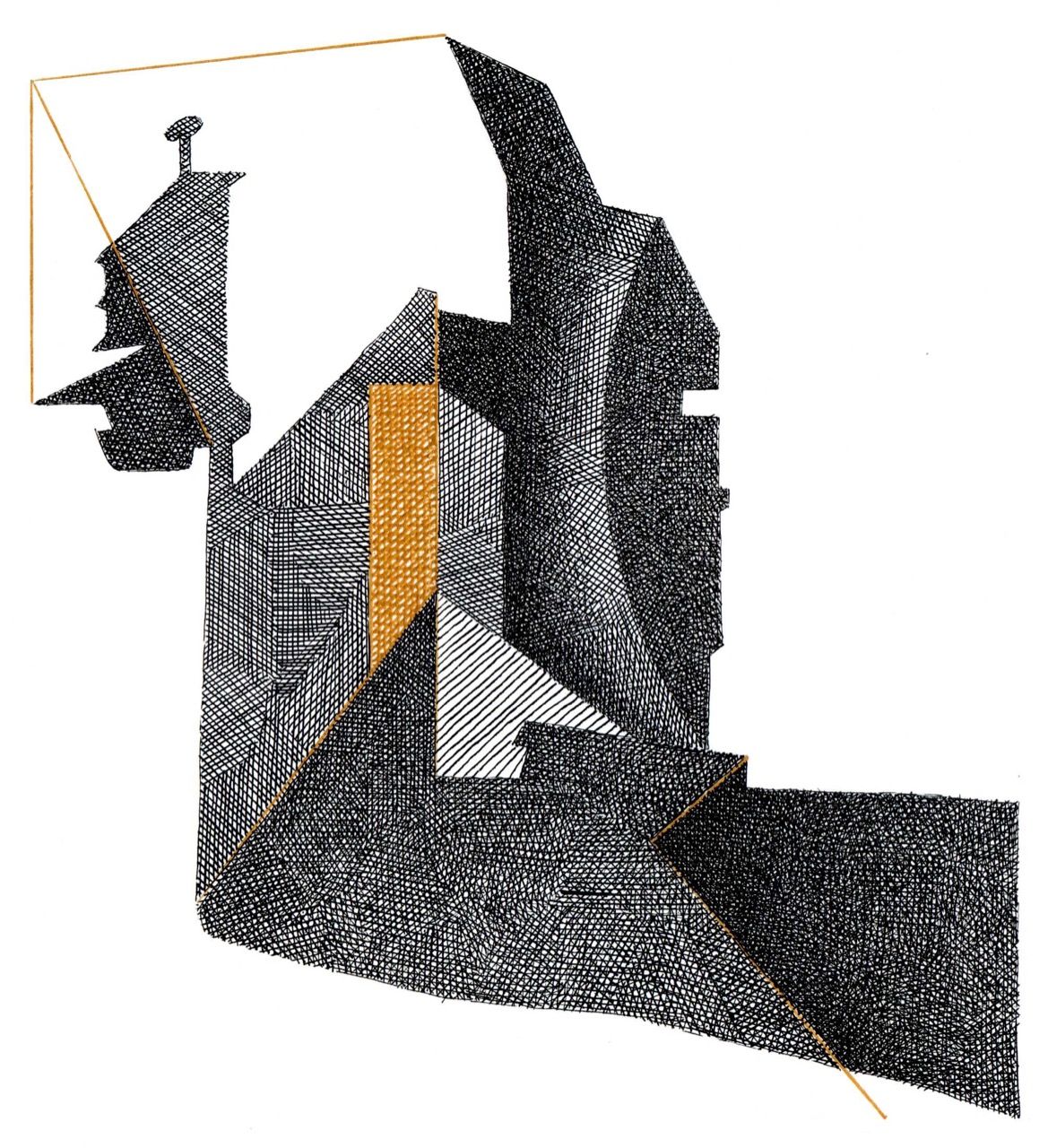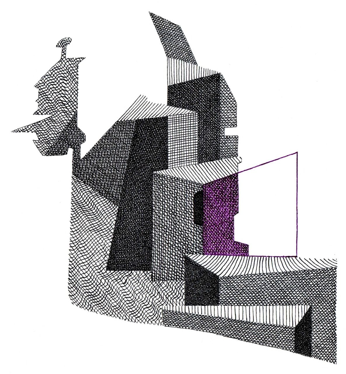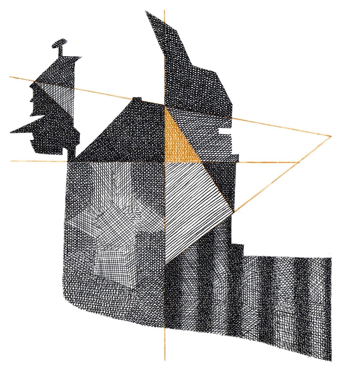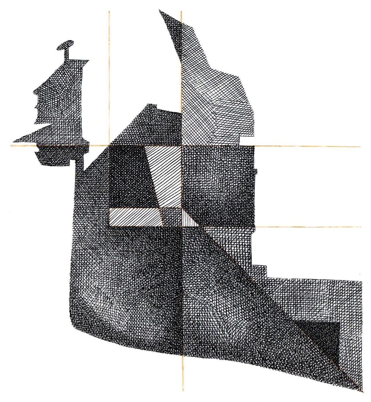 Lockdown Series 2020 The series began with a photograph of an urban back alley, taken during the pandemic lockdown. Overall, a pattern of core and cast shadow caught my eye. This pattern became the basic template for sixteen drawings, each exploring the the variety of possibilities within the larger, locked-down shape.